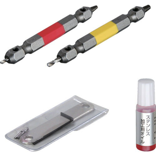 ●全長(mm):65●セット内容:M2.5~M3ねじ対応ビット1本、M4~M5ねじ対応ビット1本、スペアドリル1.5・2mm各1本、スペアねじ部品M2.5~3、M4~5用各1本、ステンレス加工用オイル、専用レンチ・スパナ各1本●用途:鉄・ステンレス用
