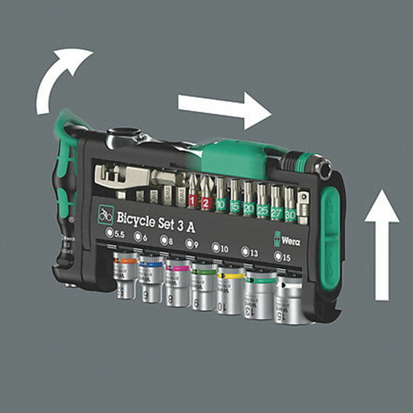 Wera「Tool-Check 自転車用セット3A」は、ミニラチェット/ドライバー/ビット&ソケットに、チェーンツールとフックまで加えた“走れる整備台”な40点キット。