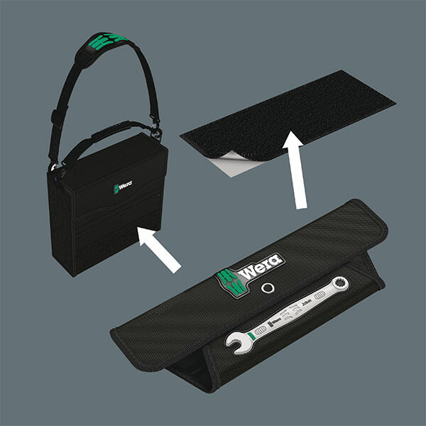 ジョーカーポーチは、背面の面ファスナーシステムにより、壁、棚、ワークショップ用トロリー、Wera 2go システムへの取り付けに適しています。