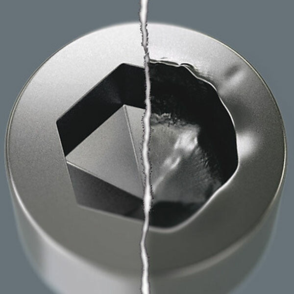 WeraのHex-Plusプロファイル採用で接触面積を拡大し、ノッチ効果を抑えてネジ頭のダメージを大幅低減。