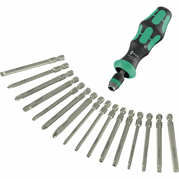 Weraの「KFコンパクト 1/4」は、細かいギアを内蔵したラチェットドライバーと、実用度の高い89mmロングビット16本をひとまとめ。