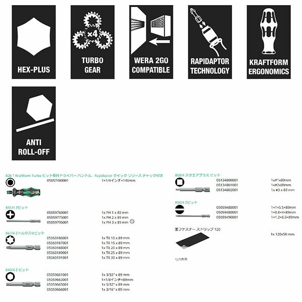 Rapidaptor ビット ホルダーのおかげで、Kraftform Turbo はさまざまなネジ形状に対応するすべての従来の 1/4 インチ六角ビットと併用できます。