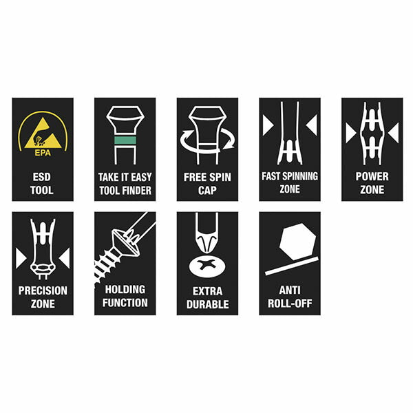 Take it easyカラーコードにはサイズの印が付いており、刃先別に色分けされているので、必要なツールが素早く簡単に見つかります。